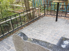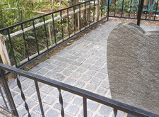 Переходим к завершающему этапу работы. Переустанавливаем уже стоящий памятник, немного его приподнимая, и закладываем территорию участка гранитной брусчаткой.