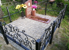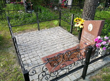 Так выглядело место захоронения на момент окончания работ: оградка заменена, памятник дополнен цветником и вазой, земля укрыта брусчаткой. Помимо этого, мы покрыли секции ограждения серебрянкой.